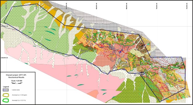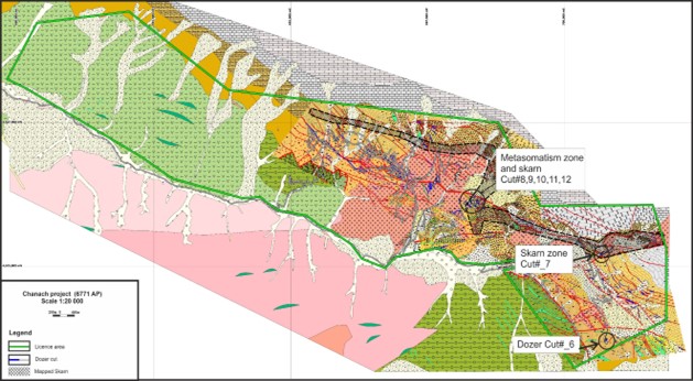 - Latest exploration program at Chanach included ground truthing, targeted soil sampling, the digging of seven dozer cut trenches across the 6.5km skarn and outcropping quartz and a magnetic survey
