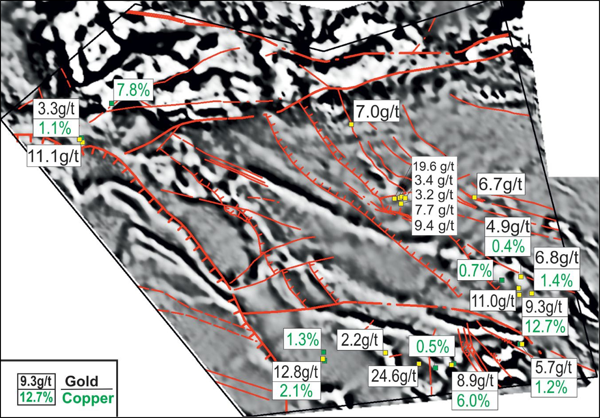 - Results from the geochemistry show large areas of anomalism (+0.05ppm Au and +0.01% Cu) both in gold and copper stretching over the majority of the identified structures