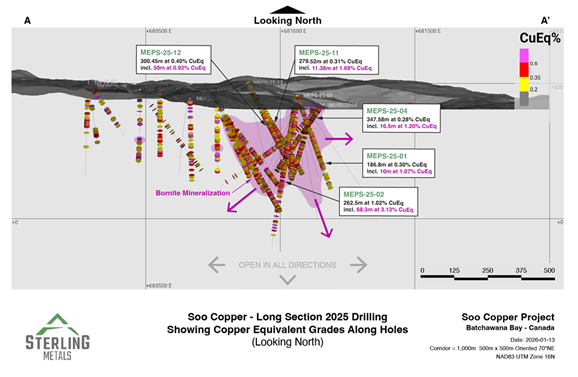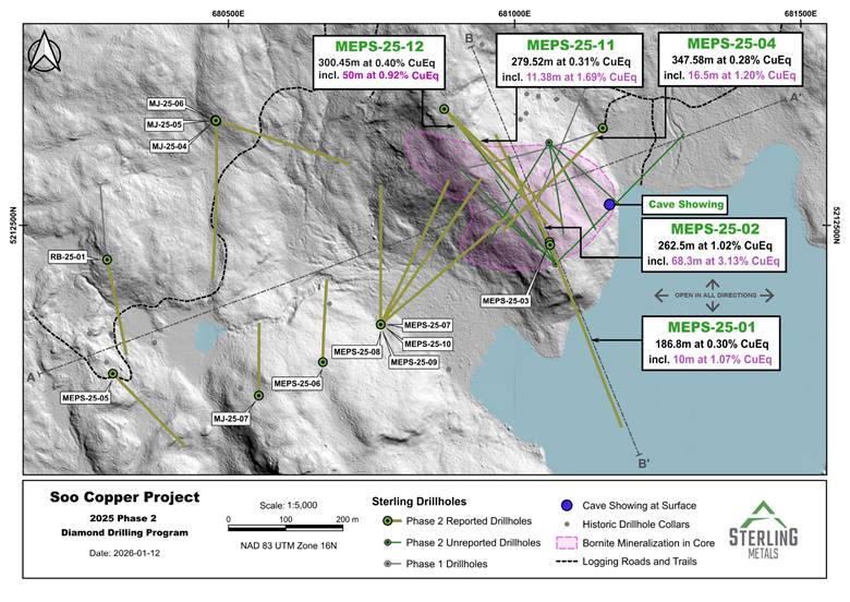 TORONTO, ON / ACCESS Newswire / January 15, 2026 / Sterling Metals Corp. (TSXV:SAG)(OTCQB:SAGGF) ("Sterling" or the "Company") is pleased to report new assay results from its expanded and completed 2025 drilling program at the Soo Copper Project ("Soo Copper" or the "Project") located near Batchewana Bay, Ontario. These new results continue to expand a continuous zone of porphyry copper mineralization first highlighted earlier last year in MJ-25-01 which was later found to contain very high-grade bornite mineralization as previously reported in discovery hole MEPS-25-02 (see press release dated September 29, 2025).