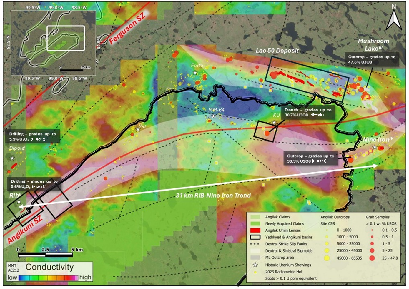 Troy Boisjoli, CEO commented: "We believe Angilak represents one of the most compelling uranium exploration opportunities in the industry. The Company is extremely excited to kickoff its 2025 Angilak exploration program, after a successful 2024 campaign. During the Company's maiden Angilak program we successfully expanded the envelop of mineralization at the Lac 50 Deposit by drilling 25 step out holes, all of which were mineralized and regionally, identified high-grade Athabasca-style potential of the Angikuni Basin. With mobilization complete and modern geophysics underway, we are advancing toward a high-impact drill program targeting shallow, high-grade uranium along the 31-kilometre Rib-Nine Iron corridor. Our goal is clear: to define the kind of discovery that could redefine the region's importance in the global uranium landscape."