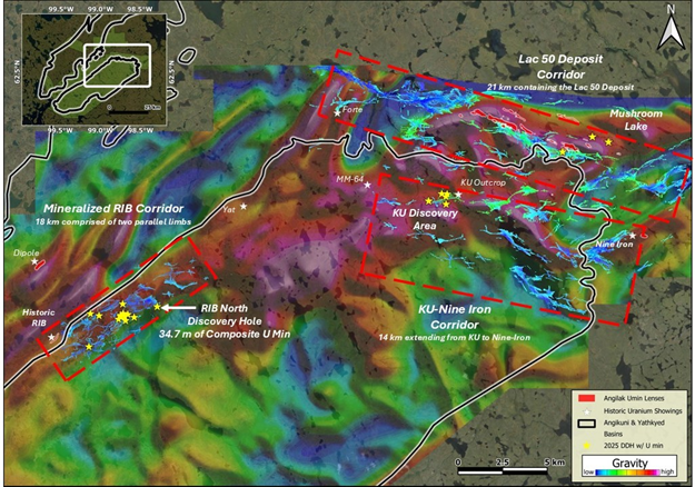 3. Mineralized RIB Corridor: Located within the western edge of the Angikuni Basin, currently defined as 18 km long, where mineralization has been identified from the Historic RIB showing3 in the south through to an additional four showings discovered during the 2025 Angilak Exploration Program, including RIB North Discovery, where the maiden drillhole, RIBN-DD-001, returned assays with 34.7 m of total composite uranium mineralization1, including 13.6 m grading 0.53% U₃O₈, 1.1 m grading 4.81% U₃O₈, and grades up to 8.16% U₃O₈ over 0.5 m.