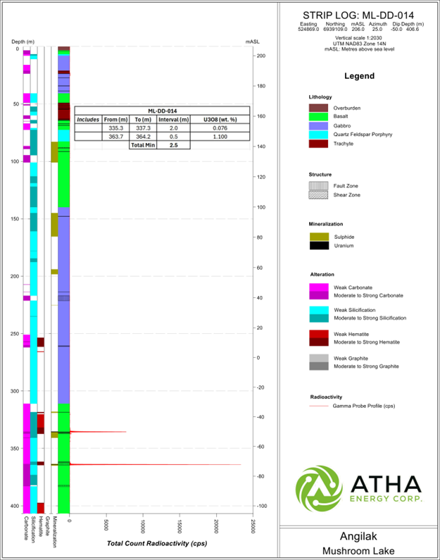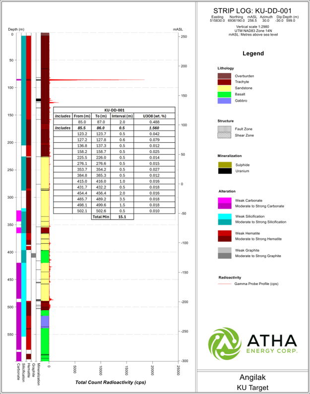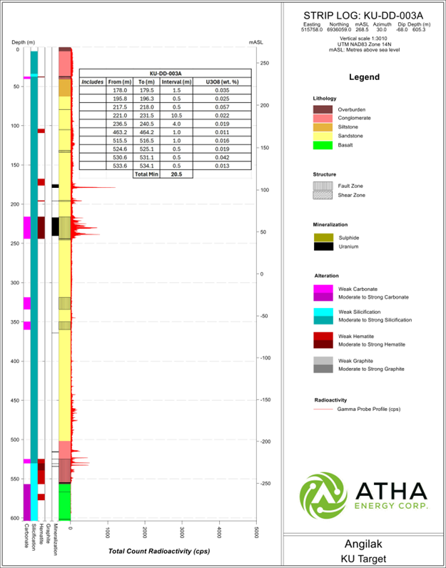 Detailed lithologic striplogs, including assay results tables, for all nine drillholes can viewed in the Supplementary Release on ATHA Energy's website (Striplog Data).
