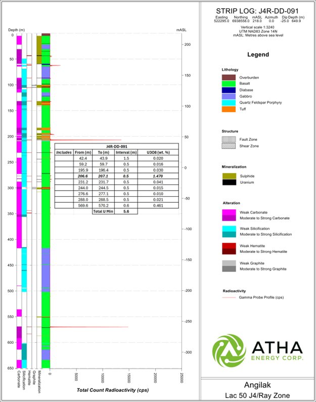 Drillhole J4R-DD-091 (Figure 7), which intersected total composite mineralization1 of 5.6 m, from 42.4 m down to a depth of 570.2 m, including an intersection of high-grade mineralization2 of 1.47% U3O8 over 0.5 m;