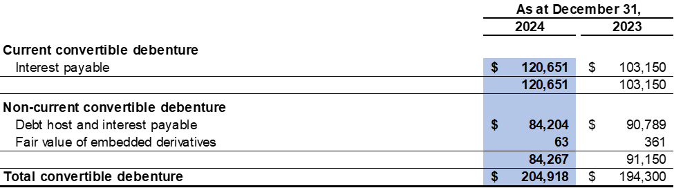 For the year ended December 31, 2024, the Company recorded interest expense of $37,103 related to the convertible debenture as a finance cost (2023: $46,337). The interest expense consists of the interest at the contract rate and the accretion of the debt host component of the convertible debenture. To calculate the accretion expense, the Company uses the contract life of 30 years and an effective interest rate of 14.1%.