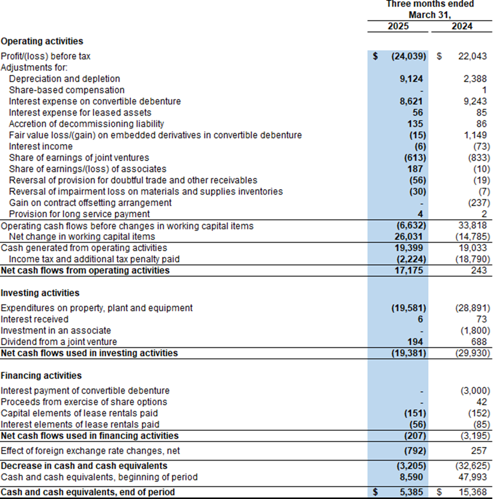 The Company recorded a $15.7 million loss from operations for the first quarter of 2025 compared to $32.1 million profit from operations for the first quarter of 2024. The decrease was mainly due to the decreased average realised selling price and the change in product mix, as the Company sold more processed coal with higher production costs during the first quarter of 2025.