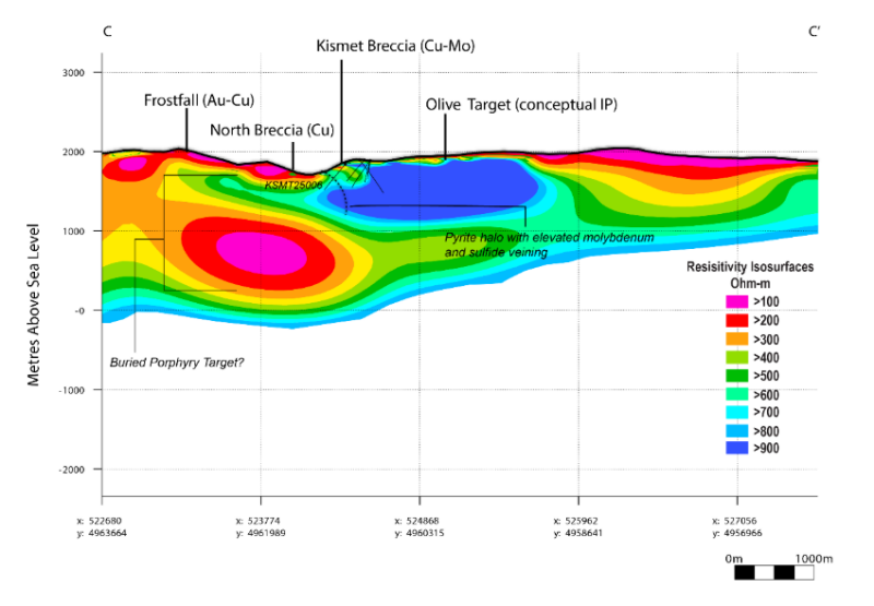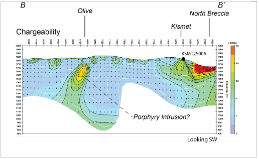 These geological observations are supported by newly-acquired induced polarization (IP) and Magnetotelluric/Extremely Low Frequency (MT/ELF) geophysical data, which define a large, coherent conductivity anomaly at depth beneath the Kismet and North Breccia trend; this represents a priority porphyry target to begin drilling in 2026.
