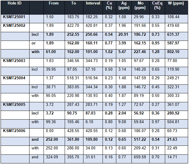 KSMT25006 intersected 109.80 m of 0.54% CuEq (0.12% Cu, 0.65 g/t Ag, 517 ppm Mo), within 428.55 m of 0.278% CuEq (0.12% Cu, 0.68 g/t Ag, 186 ppm Mo)