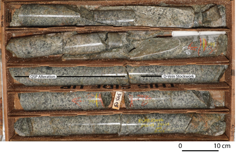 Figure 3: KSMT25006 Intrusive Mineralization at Depth of 345.03m – Molybdenite & Chalcopyrite with QSP Alteration & D-Vein Stockwork