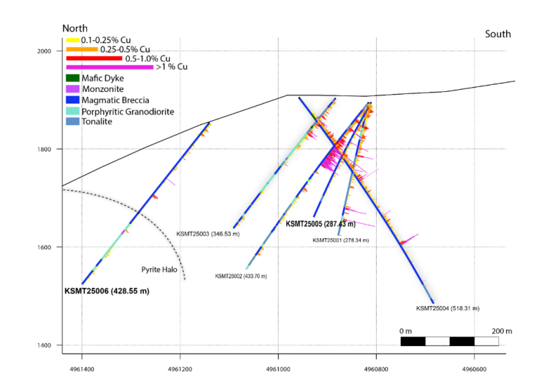 KSMT25005 intersected 87.03 m of 0.36% CuEq (0.285% Cu, 2.04 g/t Ag, 57 ppm Mo), within 287.43 m of 0.27% CuEq (0.19% Cu, 1.27 g/t Ag, 72 ppm Mo)