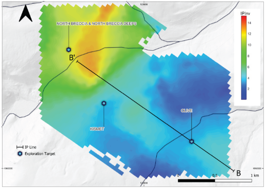 IP was completed during the 2025 season by Moombarriga Geoscience Pty. LT totalling 4.8 line-km. The IP was targeting the zone between the North Breccia Target and the Olive Creek drainages. The IP reveals several conceptual targets that will be followed up on during the 2026 exploration campaign.
