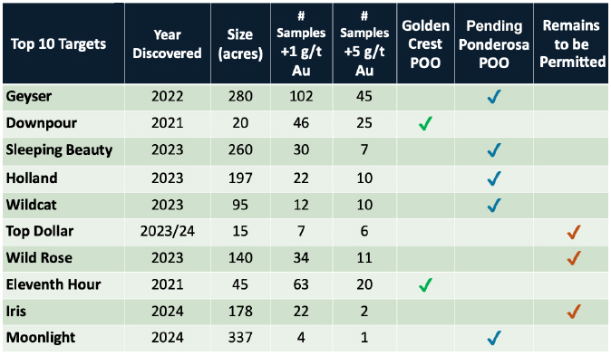 Solitario has identified ten high-priority surface targets (including both the Golden Crest area and the currently undrilled Ponderosa area) as shown in the table below. Two Golden Crest targets, Downpour and Eleventh Hour, were drilled last year. Five new targets are currently being permitted and are scheduled to be drilled in 2025. The other three high-priority targets may undergo future permitting following further review. In addition to the ten currently defined high-priority targets, Solitario has identified another dozen promising target areas that require additional early-stage surface exploration work. Solitario's future drilling will test both strong surface gold anomalies as well as the underlying and highly prolific replacement deposits of the Lower Deadwood Formation, paleo-placer mineralization at the lower contact of the Deadwood and the older Precambrian Homestake banded iron formation, all prolific geologic producers in the greater historic Homestake mining district.