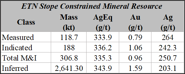 The 2026 PEA underground mine and mineral processing plan is scheduled over a production period of ~17 years. The mine plan portion of the Mineral Resource Estimate for the El Tigre 2026 PEA totals 5.0 Mt at average grades of 331.7 g/t AgEq, 251.3 g/t Ag, 0.91 g/t Au, 0.03% Cu, 0.10% Pb and 0.17% Zn (base metals provide no economic benefit under the proposed cyanidation process). Approximately 85% of the mine plan portion of the Mineral Resource, including historical tailings and low-grade stockpile mineralization, is classified as Measured and Indicated.