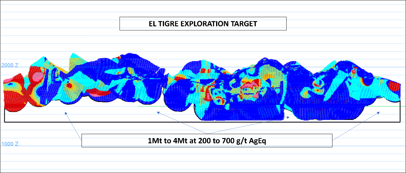 With prospective areas down dip of Northern Veins (El Tigre #2) and down dip of PEA focused Southern Veins with the disclosed Exploration Target establishing 1 to 4 million tonnes at 200 to 700 g/t AgEq (Figure 6). These areas are the along strike and dip of defined veins, are defined as "Exploration Potential" in the block model and would require infill drilling to reach Inferred classification. Underground drilling will target much of this Resource with infill and near-mine exploration. Due to higher grade, reduced tonnage UG in 2026 MRE, the exploration target has consequently increased in grade, however, lowered in tonnage.
