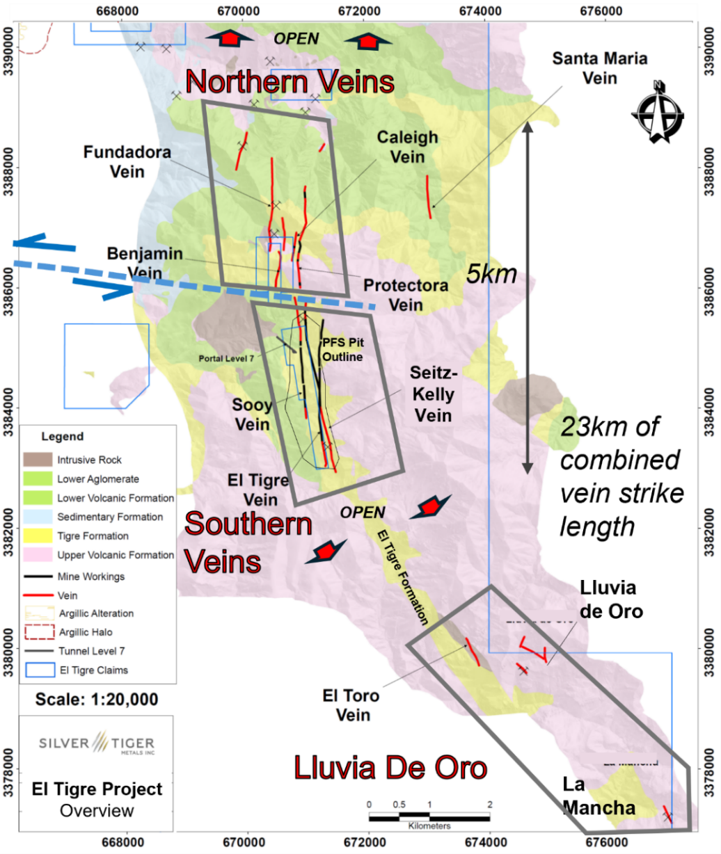 The El Tigre historical mine district is located in Sonora, Mexico and lies at the northern end of the Sierra Madre silver and gold belt which hosts many epithermal silver and gold deposits, including Dolores, Santa Elena and Las Chispas. The high-grade epithermal veins dip steeply to the west, and are typically 0.5 m wide, and locally can be up to 5 m in width. Over 25 km of these veins have been mapped along strike on surface at El Tigre. Based on the extensive historical workings, veins are inferred to extend to more than 450 m depth with many reaching strike length of 3 km or more. On the prospective El Tigre Property are both brownfields and greenfields targets defined by extensive Silver Tiger drilling (>120 km) and over 60 discovered small-scale workings in addition to the historic El Tigre Mine. The little drilled Northern Veins have the same geology and structure at the Southern Veins, for which the PEA is based on (Figure 4). Whereas Lluvia de Oro shows potential for Property pit expansion with the conjunction of high grade veins and the host to the Stockwork Zone: the El Tigre Formation.