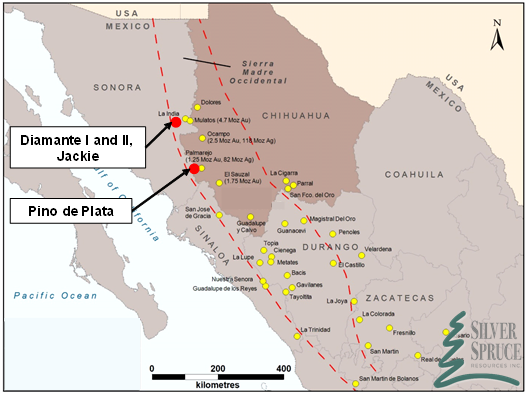 Figure 2. Regional Map of Sierra Madre Occidental Deposits showing Silver Spruce property locations.