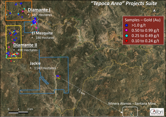 Figure 3. Sonora claim packages including Silver Spruce /Colibri's Diamante I and II and Jackie, and Colibri's El Mezquite, showing property-wide gold assays from rock sampling programs.