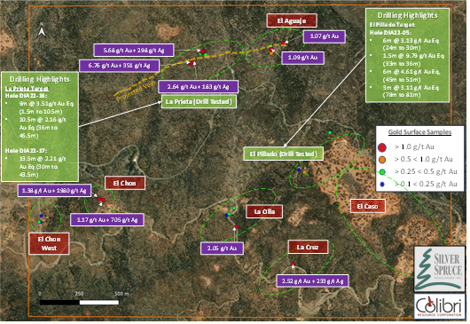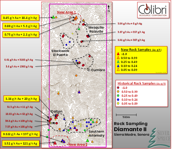 Ian McGavney, President & CEO of Colibri commented: We are very pleased with these new results which significantly expands the footprint of known mineralization on the Diamante II concession. We will be continuing this early stage exploration approach and anticipate that our further geological mapping, prospecting, and continued evaluation of historical showings will provide the structural and alteration framework in which to interpret the extensive epithermal mineralization system evident on the property. We are also modeling, evaluating, and interpreting work previously completed, including the 2022 drilling, with the objective of prioritizing drill targets for a second drill program planned for early 2024.