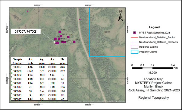 "As per our planned summer programs, we initiated and completed in three stages, over the Marilyn claim block, prospecting, rock and soil sampling, structural mapping and further regional till sampling with a primary view to drill target generation in Q4 2023. Prospecting of the new Marilyn claims identified localized float and outcropping rock samples showing intense silicification with iron carbonate accompanied by multi-phase siliceous veins and breccias, and minor to trace arsenopyrite, pyrite, chalcopyrite and malachite (see Figures 2, 3 and 4). Gold to 1035 ppb, arsenic to >1000ppm and antimony to 346 ppm are typical to the coincident precious metals and pathfinder elements of the regional orogenic mineralizing systems", said Greg Davison, Silver Spruce VP Exploration and Director. "Structural geological mapping on the ground and desktop analysis of the property geophysics reported an E-W trending topographic and magnetic lineament associated with steeply south-dipping quartz veins, brecciation and carbonate alteration exposed along the banks of Tote Brook. Mineral textures of vuggy quartz and laminated chalcedony point to high-level epizonal veins though more evaluation of the spatial position within the system is clearly warranted."