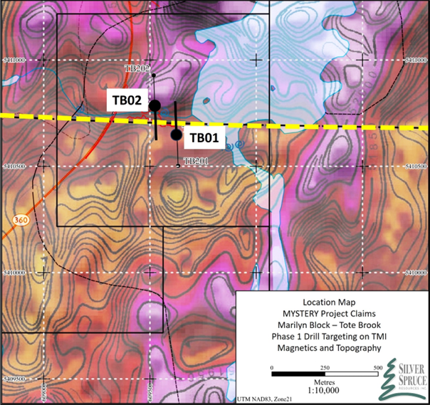 "We are pleased to announce that an initial 4-hole drilling plan was developed to target the downdip projection of the surface vein exposures at Tote Brook (Figures 4 and 5). Further work to isolate and orient the bedrock source and define Au-bearing drill targets in the southern Marilyn claim also will be a focus of the follow-up field program," added Mr. Davison. "The drill permit application was submitted to the Mineral Lands Division of the Department of Industry, Energy and Technology (IET). Diamond drilling is scheduled to follow immediately upon receipt of all requisite IET and MOT permits."