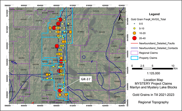 The Company's reconnaissance sampling (95 sites) was completed before the winter 2021 shutdown and an additional thirty-four of the readily accessible sites were tested during the 2022 field season. The 2023 till sampling (66 sites) of the new claims identified our best gold grain frequency data so far with a maximum of thirty-nine grains in GR-37 (see Figure 6) in the southern part of the claims and other significant results spread from north to south throughout the Marilyn claims.