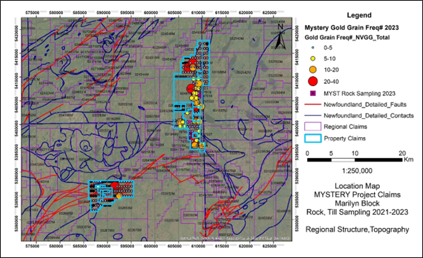 Recent map staking (see Press Release February 8, 2023) of additional claims tied to both the Marilyn and Till properties effectively doubled property coverage to 148 square kilometres (14,790 ha). The new claims occur adjacent to several gold grain and geochemical anomalies reported from the Company's 2021 and 2022 Phase 1 programs.