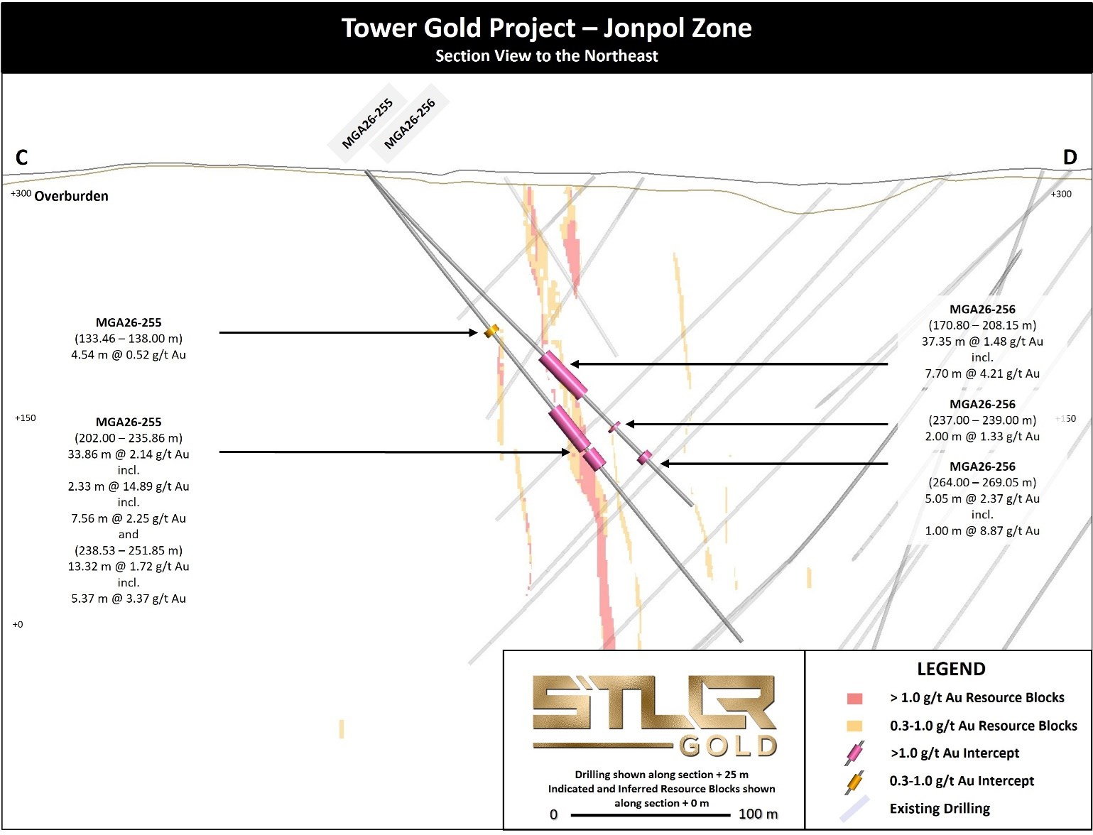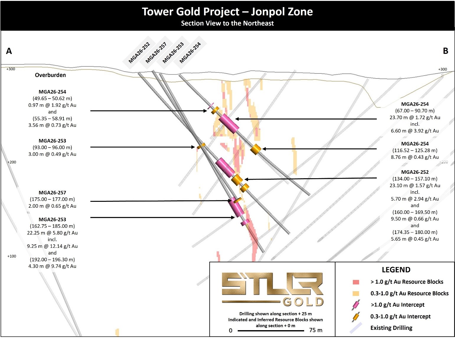STLLR Gold Intersects 6.03 g/t Au over 22.25 m (Including 12.67 g/t Au over 9.25 m) and 2.14 g/t Au over 33.86 m (Including 14.89 g/t Au over 2.33 m) at the Jonpol Deposit of the Tower Gold Project