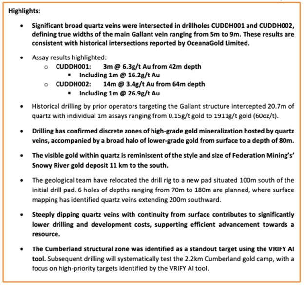 RUA GOLD reports high-grade gold intercepts from drilling at Cumberland, including 1m @ 26.9g/t Au and 1m @ 16.2 g/t Au, confirming continuity of mineralization at the Gallant target