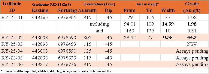 • Drill hole RY-25-01 intersected 1.02 g/t gold over 37 metres, including 1.98 g/t gold over 15 metres.