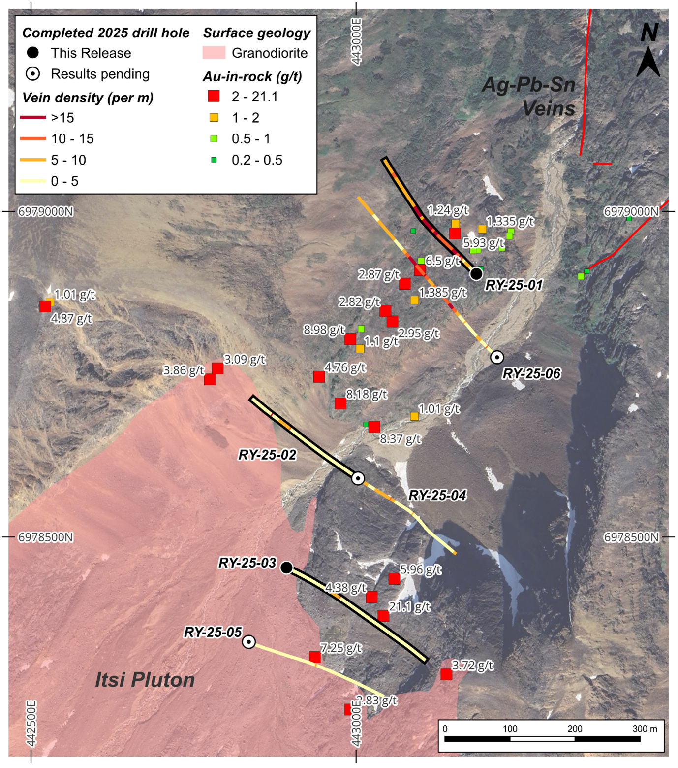 Hole RY-25-02 was collared 360 m to the southwest of RY-25-01, flanking the mapped extent of the Itsi Pluton. While sheeted vein density was substantially lower than observed in the first hole, gold results from an intersection of quartz veining in this hole yielded 44.3 g/t gold over 0.58 m, from 26.42 m. The hole cut predominantly hornfelsed siliciclastics, along with several narrow intervals of intermediate dykes and irregular, patchy granodiorite. Altered granodiorite is visible in the attached Photo 2, near the reported interval.