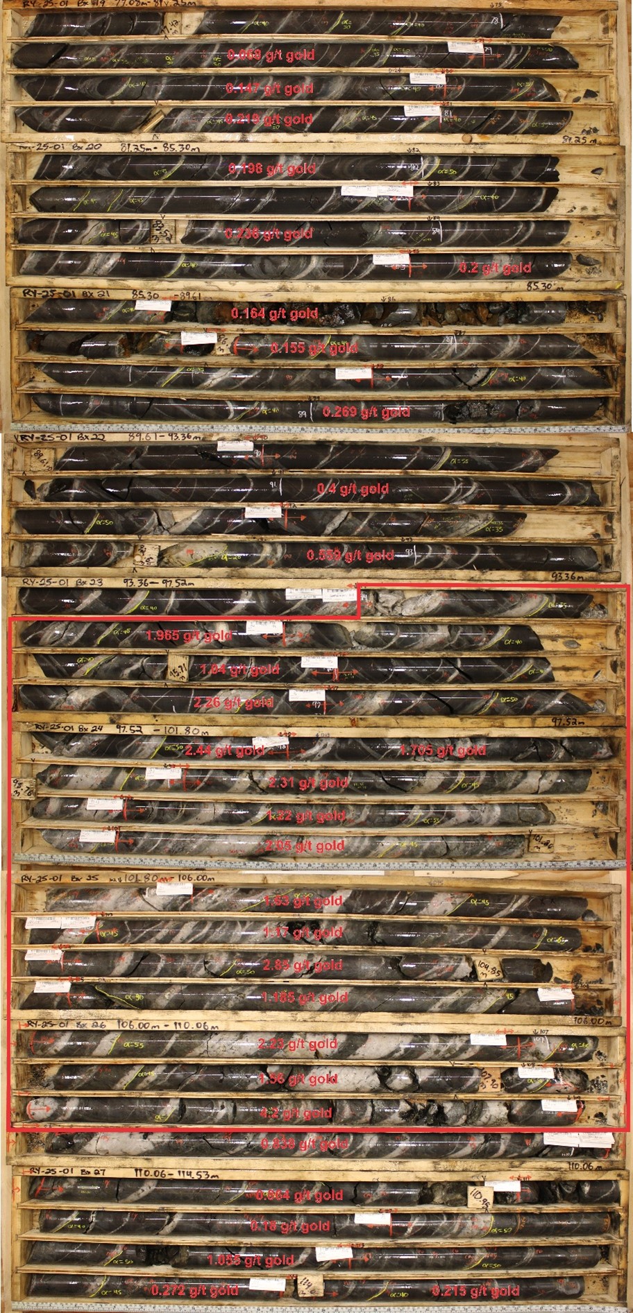 Photo 1 - Drill core from hole RY-25-01, 77.08 to 114.53 m annotated with individual sample results. Highlighted interval grades 1.98 g/t gold over 14.99 m.