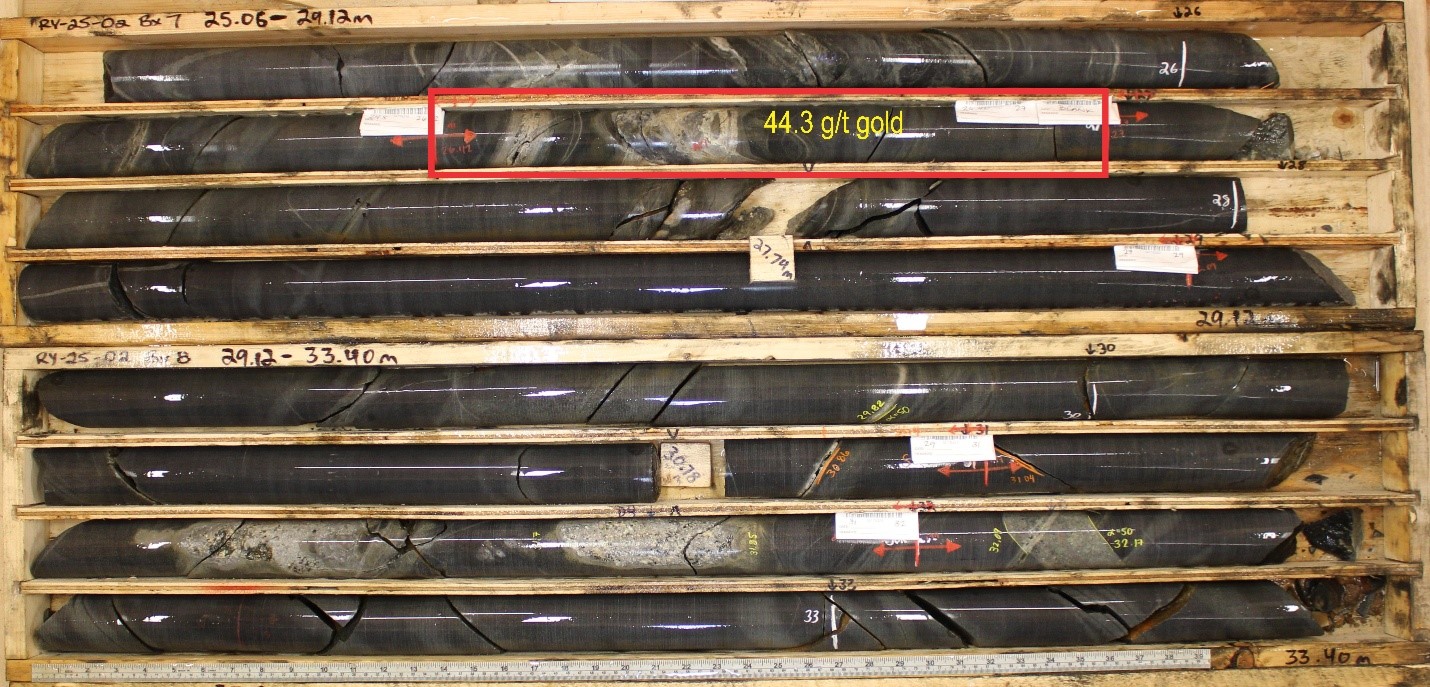 Photo 2 - Drill core from hole RY-25-02, between 25.06 to 33.40 m, with an intercept of 44.3 g/t gold over 0.58 m highlighted.