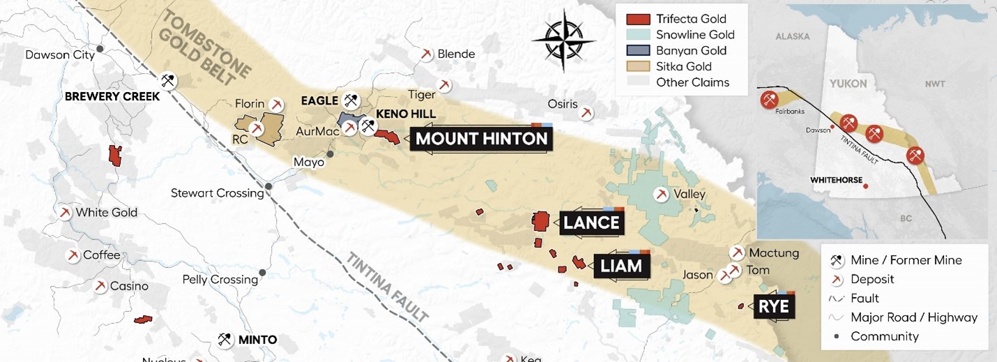 Trifecta is a Canadian-based precious metals exploration company dedicated to increasing shareholder value through the discovery and development of 100% held gold projects in Yukon and Nevada. Trifecta has secured an option to acquire a 100% interest in Mt. Hinton, Rye and 9 other highly prospective, intrusion-related gold projects located in Yukon's Tombstone Gold Belt where over 17 million ounces of gold have been discovered since May 2020. Initial drilling at the Company's Yuge Gold Project, located in northern Nevada, has identified multiple broad zones of gold mineralization near historical high-grade mines. The Company's Eureka Project hosts an 8 x 2.5 kilometre belt of surface showings and anomalous gold-in-soil that straddle the headwaters of two of the most productive placer creeks in Yukon's southern Klondike Goldfields. Trifecta's Treble Project covers a large hydrothermal system, located midway between Western Copper and Gold Corporation's Casino Deposit, the largest copper and gold deposit in the Yukon, and Rockhaven Resources Ltd.'s Klaza Deposit, a high-grade gold-silver deposit.