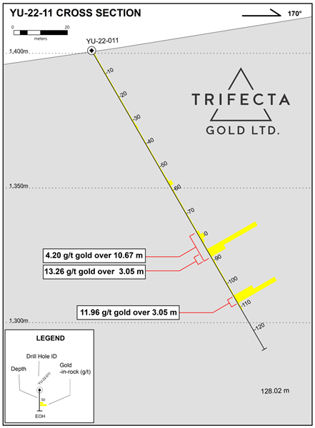 - 11.96 g/t gold over 3.05 m from 105.16 m downhole also in hole YU-22-11.