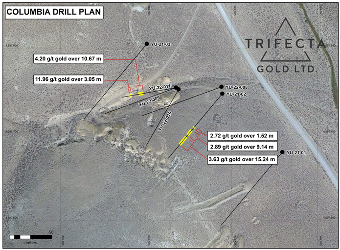 Results are pending for holes YU-22-08,-09 and -10, which were also drilled at the Columbia Zone. Drilling at Columbia targeted 40 to 50 m separation between projected drill piercements on the high grade structure intersected in hole YU-21-02 (2.27 g/t gold over 38.1 m including 15.5 g/t over 1.53 m) as announced March 18, 2021.
