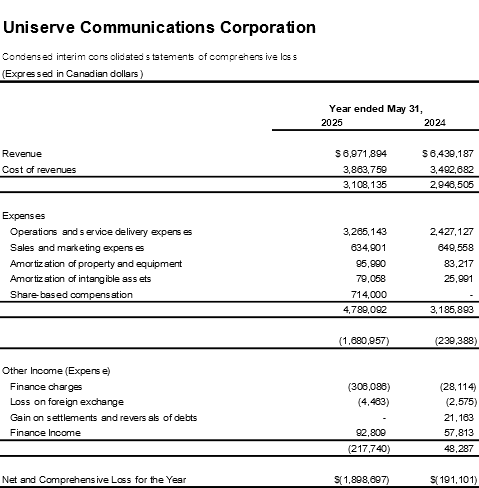 Vancouver, BC: September 30, 2025 – Uniserve Communications Corporation (the “Company” or “Uniserve”)(TSXV: USS) a provider of IT solutions and services to business and residential customers in Canada wishes to announce its annual fiscal 2025 financial results. Revenues for fiscal 2025 were $6,972K as compared to $6,439K for the prior fiscal year. The annual fiscal 2025 Operating Loss was $1,681K compared to an Operating Loss of $239K for the prior fiscal year. Net loss for fiscal 2025 was $1,899K as compared to Net loss of $191K for the prior fiscal year.