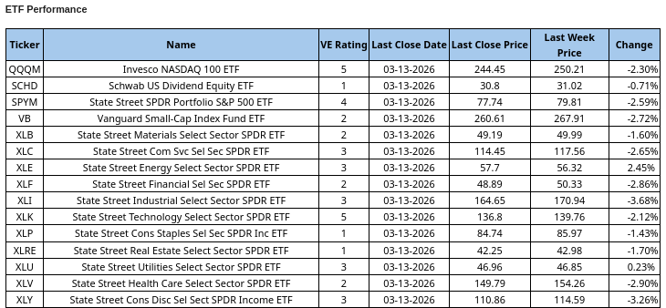 However, two major reversals of tremendous year-to-date price gains confounded our expectations. GDX, the VanEck Gold Miners ETF that recently had our highest rating of 5 lost 9%, more than halving its year-to-date gain to just 8.7%! In its related move, GLDM, the SPDR Mini Gold Shares ETV, declined a combined 3% on Thursday and Friday shaving its still-impressive year-to-date return to 15.8% from nearly 20%. Even more surprising to many during war, 5-rated ETF XAR, the SPDR Aerospace ETF, declined 5% on the week, more than halving its year-to-date gain to 5.7% from 11%. XAR was one of the focal points of our most recently submitted-for-publication blog in which we observed that the ETF and its stocks could be flying too high given stratospheric valuations. Despite that, we think the sub-sector’s largest stock, GE Aerospace (GE), should recover nicely and has room to run. Please read that full blog for more insights into the Aerospace and Energy sectors.