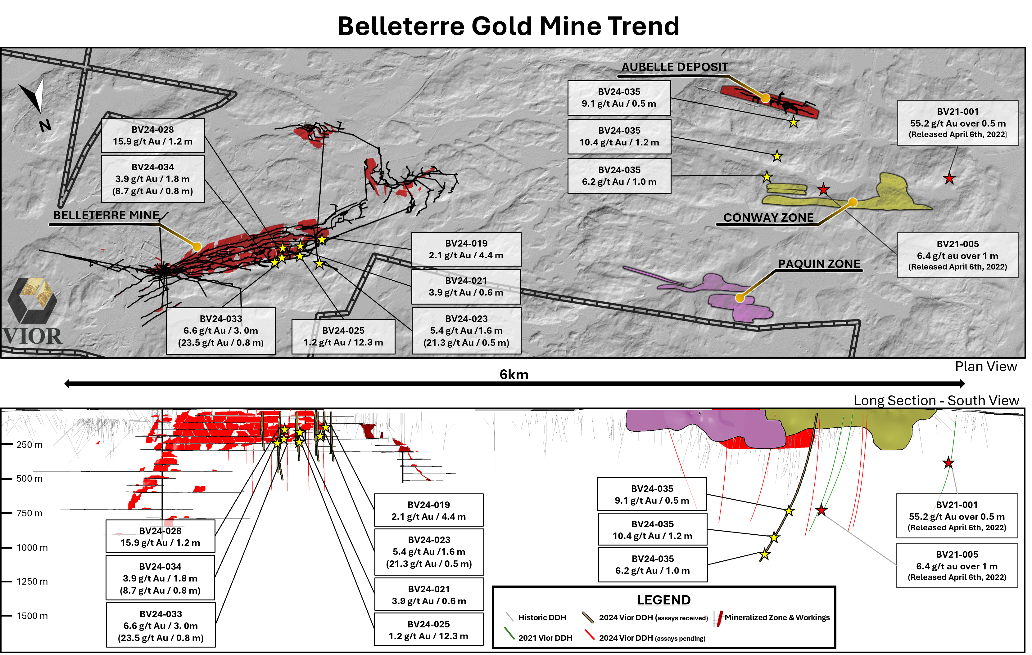 MONTREAL, QC / ACCESSWIRE / December 11, 2024 / VIOR INC. ("Vior" or the "Corporation") (TSXV:VIO)(OTCQB:VIORF)(FRA:VL51) is pleased to announce the first set of assay results from its ongoing +60,000-metre diamond drill program at its Belleterre Gold Project in Quebec's Belleterre Greenstone Belt. The drilling has successfully intersected significant high-grade gold mineralization at both the Belleterre Vein #12 and at several Aubelle targets within the 6-kilometre long Belleterre Mine Trend. These results further validate Vior's geological model and underscore the potential for extensive high-grade gold mineralization beyond the known systems.