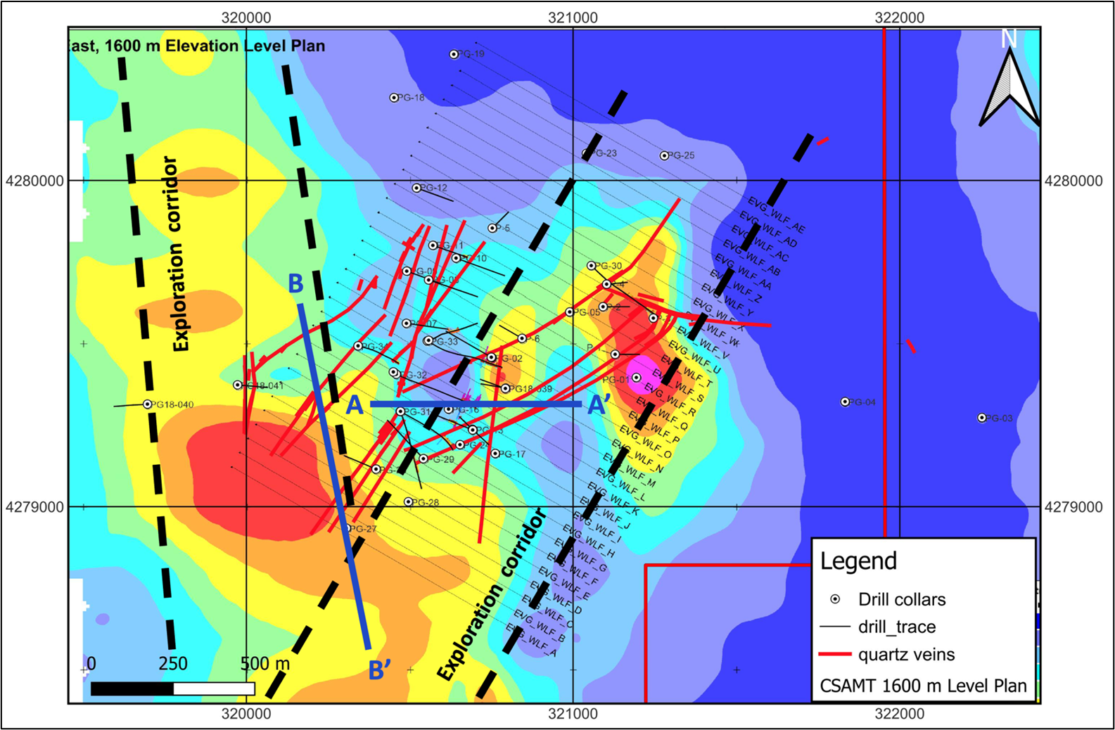 Figure 4. Proposed Drill Holes on Rockland East Target CSAMT Cross Section A-A'