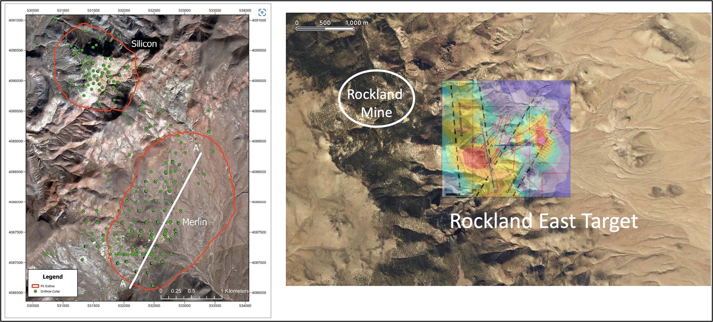 The overall size of the Rockland target area also compares favorably with that of AngloGold Ashanti's Silicon-Merlin deposit area(see Figure 3). Rockland comprises a large area of hydrothermal alteration cut by numerous quartz-adularia veins that display low to bonanza-type gold grades along with enriched silver, arsenic and antimony levels, that warrants additional drilling.