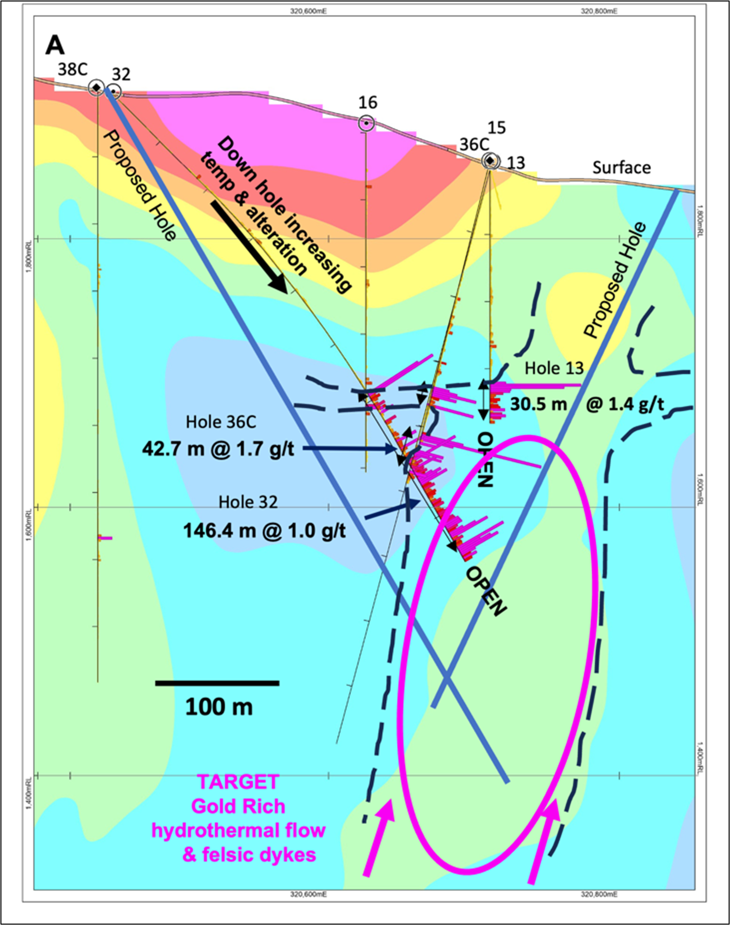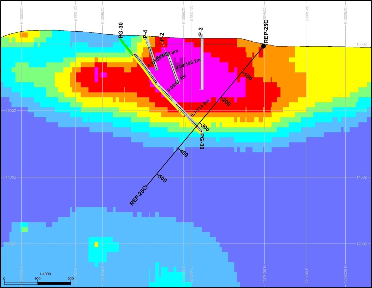 Drilling is planned to test the down-dip extension of hole PG-32, that returned 146.4 metres grading 1.0 g/t AuEq (see Figures 2 and 4). The hole PG-32 intercept lies along the northern edge of an 800 metre long, steep west-dipping CSAMT anomaly (Controlled-Source Audio-frequency Magnetotelluric) which is interpreted to represent a northeast-trending structure, an area of increased felsic volcanism and intrusions, and an area where hydrothermal fluids upwelled into structural and stratigraphic targets. This interpretation is supported, in part, by a hyperspectral scan of rock chips from hole PG-32, which indicated an increase in potassium illite content, corresponding with higher temperature alteration, to the end of the hole. It is believed that hole PG-32 was drilled just above a bonanza-type gold system or may have been stopped too soon. The first hole will be drilled from west to east to intersect the interpreted mineralized system approximately 75 metres below hole PG-32. Depending on results and validation of the orientation of the mineralized system, another hole may be drilled to test the target area from east to west. This follow-up hole could also determine if the interpreted mineralized system extends upward, closer to surface.