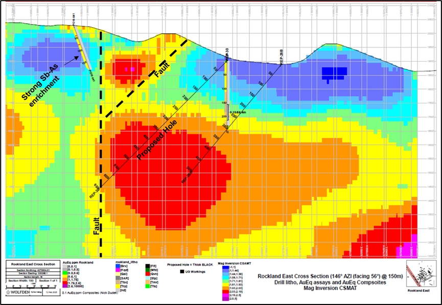 "The Rockland East target in our opinion represents one of the most exciting drill ready exploration targets in the Walker Lane Trend as it consists of 1) gold intercepts that returned up to 1.0 g/t AuEq* over 146.4 metres that ended in mineralization, 2) an historic bonanza-type Au-Ag mine is part of the property package, 3) multi-square kilometre scale, argillic to advanced argillic, rhyolite and basin-margin-debris-hosted alteration zones that are cut by quartz veins enriched in antimony, arsenic and gold, and 4) geophysical data that suggests zones and structures where hydrothermal fluids upwelled and subsequently ponded, creating wide, lower grade gold zones that are interpreted to flank high-grade bonanza-type gold grades at depth," stated Don Dudek, VP Exploration for Wolfden. "These are the typical characteristics exhibited by some of the high quality gold deposits in the Walker Lane Trend."