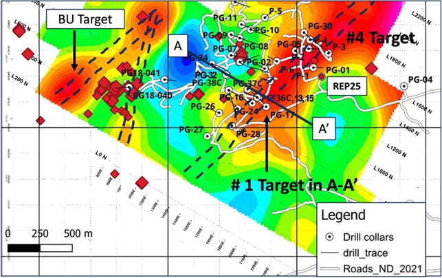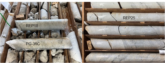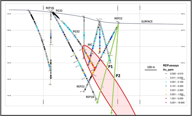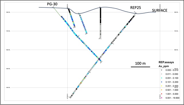 The first and third holes of the program, REP18 and REP 22, were drilled below holes PG-32 and 36C to test the extent and potential continuation of the broad mineralized zone intersected in hole PG-32. Hole REP22 was a scissor hole, drilled opposite to REP18 and PG-32, in order to better determine the geometry and extent of the mineralized zone (Figure 3).