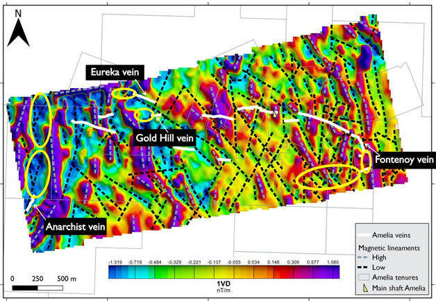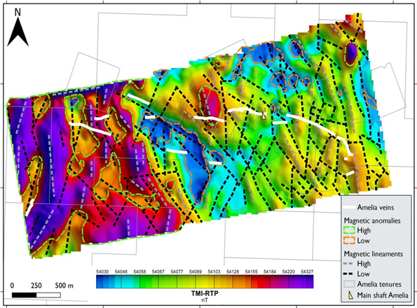 The known mineralized veins at Amelia show a moderate correlation with low magnetic lineaments. In the southwestern area that is dominated by magnetic highs, a prominent low magnetic lineament coincides with the Anarchist vein that is hosted within granodiorite. This magnetic low may correspond to hydrothermally altered granodiorite associated with the quartz vein.