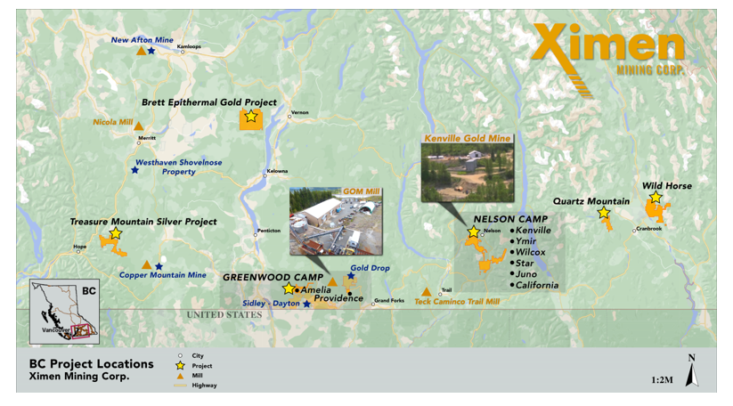 Ximen Mining Corp. owns 100% interest in three of its precious metal projects located in southern BC. Ximen`s two Gold projects, The Amelia Gold Mine and The Brett Epithermal Gold Project. Ximen also owns the Treasure Mountain Silver Project adjacent to the past producing Huldra Silver Mine. Currently, the Treasure Mountain Silver Project is under an option agreement. The option partner is making annual staged cash and stocks payments as well as funding the development of the project. The company has also acquired control of the Kenville Gold mine near Nelson British Columbia which comes with surface and underground rights, buildings, and equipment.