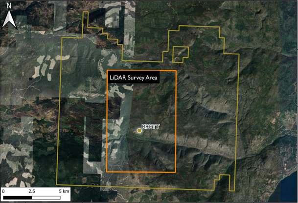 A helicopter-borne LiDAR survey was completed over an area of 54 km2 at the Brett property. The survey resulted in two products: a digital elevation model (DEM) and an orthophoto mosaic. The purpose of the survey was to obtain a high-resolution topographic base and updated orthophotos of the area since the wildfires. The DEM was used to identify lineaments related to geological and geomorphological features.