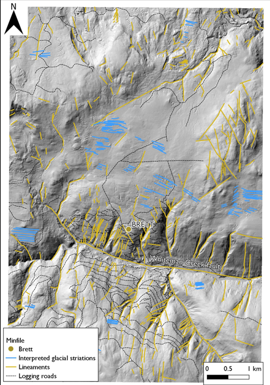 A prominent small-scale WNW-ESE trending fabric was also evident on the dataset, which is interpreted as glacial striae. In addition, infrastructure features including logging roads and previous exploration workings can be seen on the LiDAR even when obscured by vegetation.