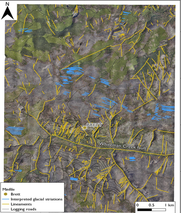 Lineaments were identified from the DEM that correspond to topographic lows. Several sets of lineament orientations were identified, including prominent NW-SE, NE-SW, N-S, and WNW-ESE sets. The largest features identified are the Whiteman Creek lineament (WNW-ESE) that coincides with the mapped Whiteman Creek fault and a NW-SE lineament south of the Whiteman Creek. Past exploration at the Brett deposit shows that the orientation of the gold mineralization is NW-SE. Therefore, NW-SE lineaments in proximity to the Brett area are considered priority for future exploration. The fracture/fault pattern determined by lineament analysis suggests that the Whiteman Creek fault may be a first-order structure with gold the mineralization controlled by secondary NW-SE trending structures.