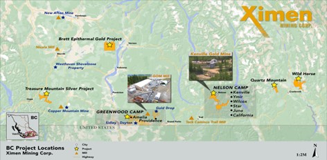 Ximen Mining Corp. owns 100% interest in three of its precious metal projects located in southern BC. Ximen`s two Gold projects, The Amelia Gold Mine and The Brett Epithermal Gold Project. Ximen also owns the Treasure Mountain Silver Project adjacent to the past producing Huldra Silver Mine. Currently, the Treasure Mountain Silver Project is under an option agreement. The option partner is making annual staged cash and stocks payments as well as funding the development of the project. The company has also acquired control of the Kenville Gold mine near Nelson British Columbia which comes with surface and underground rights, buildings and equipment.