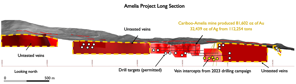 Ximen completed eight NQ-size drill holes for a total of 2,064 meters testing the down-dip extension of the historic Cariboo-Amelia gold mine. The target vein was intersected in five holes (AM23-01, 3, 5, 7 and 8) between 30 and 45 meters below the lowest mine level and over a strike length of 150 meters.