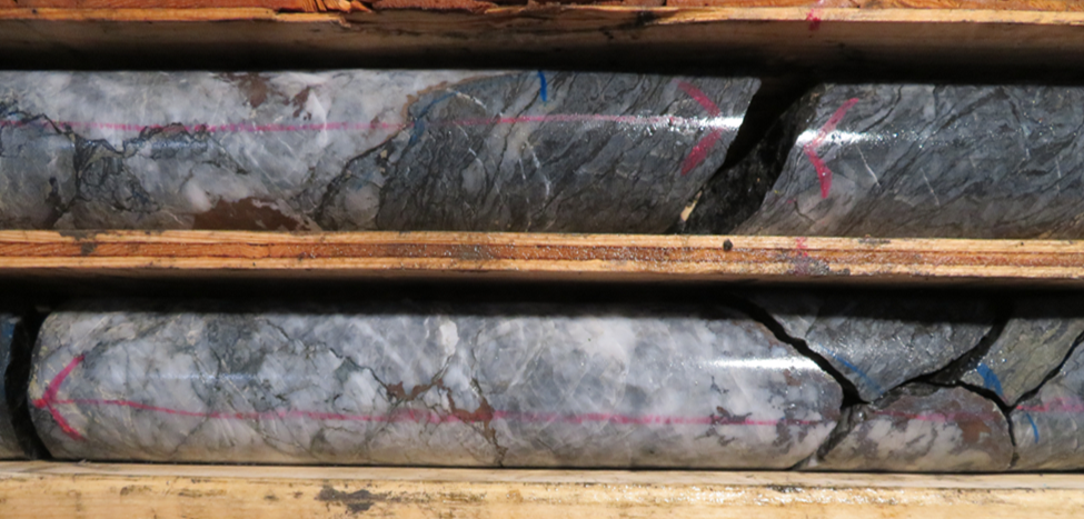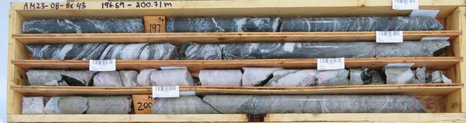 The mineralized intercepts contain pyrite, sphalerite, galena +/- chalcopyrite and pyrrhotite. Hole AM23-07 intersected multiple zones. Hole AM23-08 intersected the vein within mineralized quartz stringer alteration zone. The vein consisted of "blue quartz" containing fine grained pyrite. The "blue quartz" is a local mine term for grey quartz that typically contains gold. Visible gold hasn't been observed, but this sulphide mineral assemblage is the same as that reported to occur in the vein where it was mined historically. Core samples will be sent for analysis once the sampling is completed.